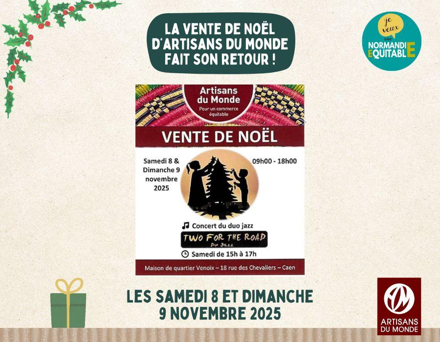 Les samedi 8 et dimanche 9 novembre 2025, Artisans du Monde vous invite à sa vente de Noël annuelle à la Maison de quartier Venoix, 18 rue des Chevaliers à Caen de 9h à 18h !