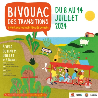 Le Bivouac des transitions est une initiative festive et conviviale qui permet d'expérimenter la transition écologique autour d’actions concrètes sur le territoire de Coutances (mer et bocage). Cette année, la thématique sera “Inventons les mobilités de demain”. L'évènement est ouvert à toutes et tous, quel que soit votre niveau. Nous partons 4 jours à vélo, du 8 au 11 juillet, au départ de la gare SCNF de Coutances, puis nous nous "sédentarisons" sur notre dernière étape : le festival Chauffer dans la noirceur, à Montmartin-sur-mer. Chaque jour, des activités sont proposées en journée (débat, atelier, jeu, émission de radio...), et des concerts et spectacles gratuits le soir. Venez participer à une aventure humaine, avec des personnes d’horizons différents pour inventer et bricoler ensemble des solutions utiles au territoire. Alors, tu viens ?!